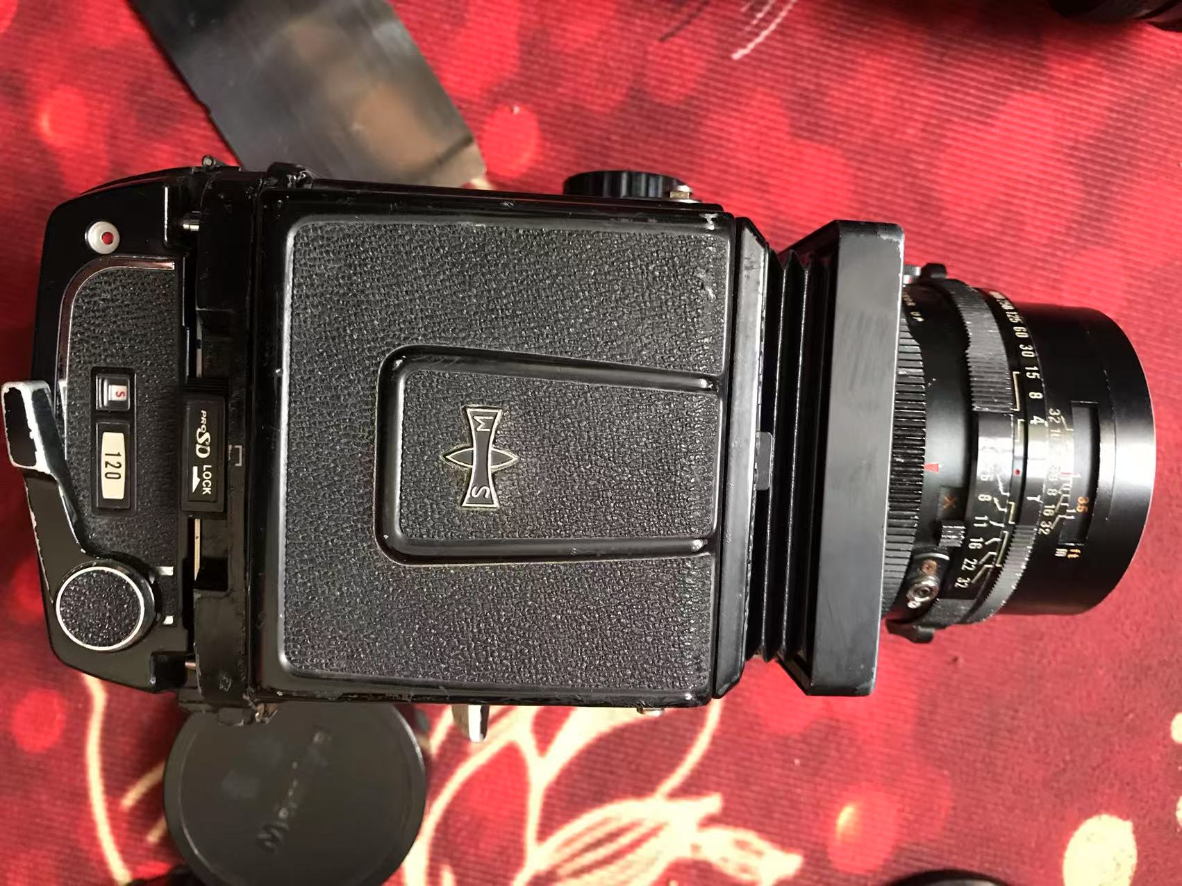 玛米亚RB67 SD中画幅相机。成色一般,功能正常,快门准确,取景器明亮,成像清晰,调焦正常,皮腔很好无漏点,机身头127 f3.8,通透明亮极微尘,尾片轻微的一点点膜痕,速度正常。附带100-200 f5.2及接环各一个,为RB、RZ67通用的,镜头镜片很好,不存在任何问题,接环也很新,都有前后盖。后背旋转的阻力不大,但不松垮,稍有外力就可转动,不清楚是否有可以固定的机关,或是机关失灵、本人不会操作的原因。后背底部的饰皮缺失,原机遮光板。顺丰到付