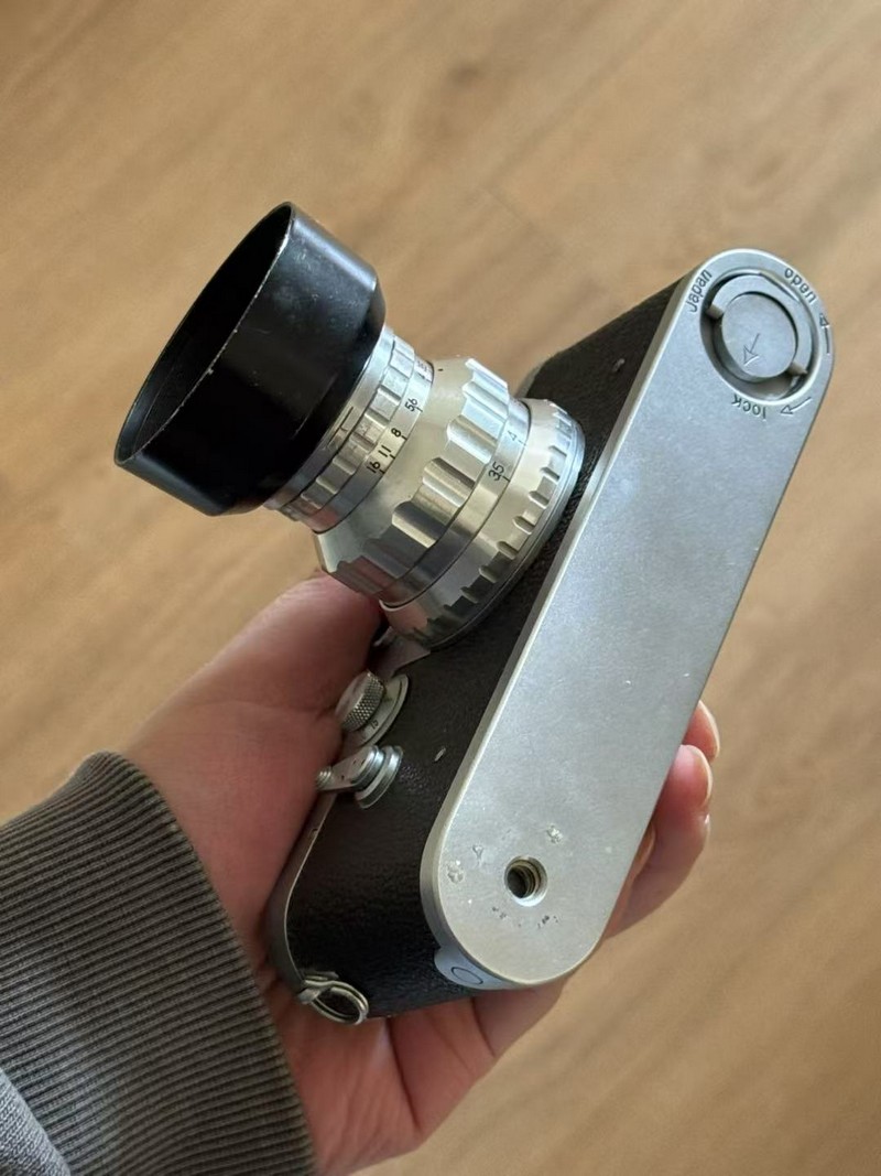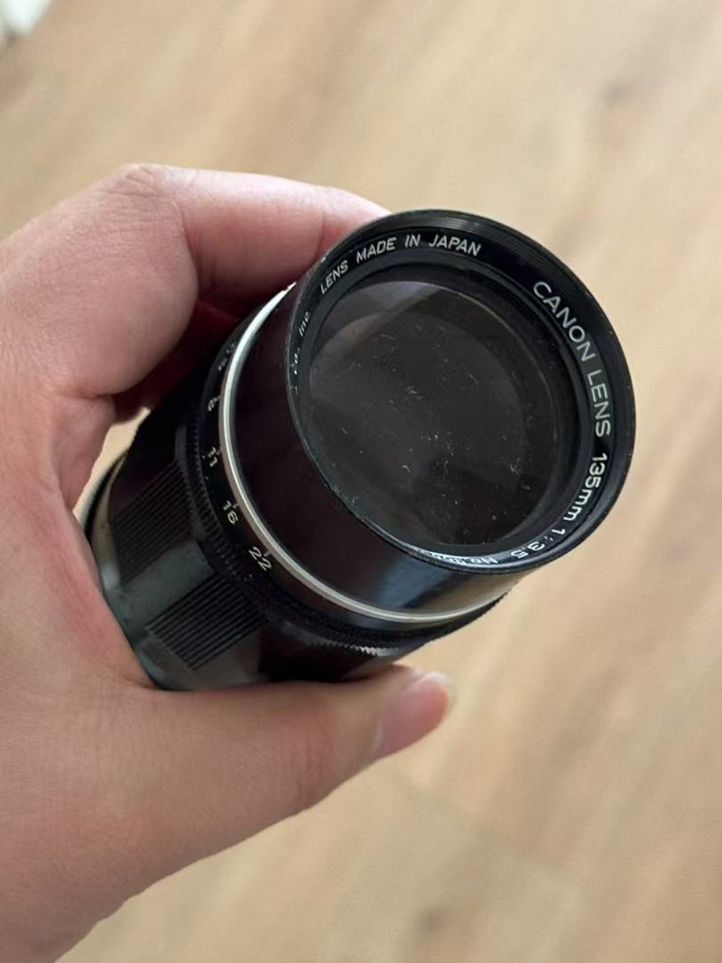 leotax 仿徕卡巴纳克套机,功能简单测试正常,第二帘有些褶皱,不确定是否漏光,黄斑清楚,快门速度变化明显。镜头为东京光学50/3.5 l39,带一片滤镜和遮光罩,玻璃基本通透,有些灰,镜头调焦阻尼感较弱。另外一支是佳能135/3.5 l39,外观尚可,通透无雾,后组有一处明显霉印。