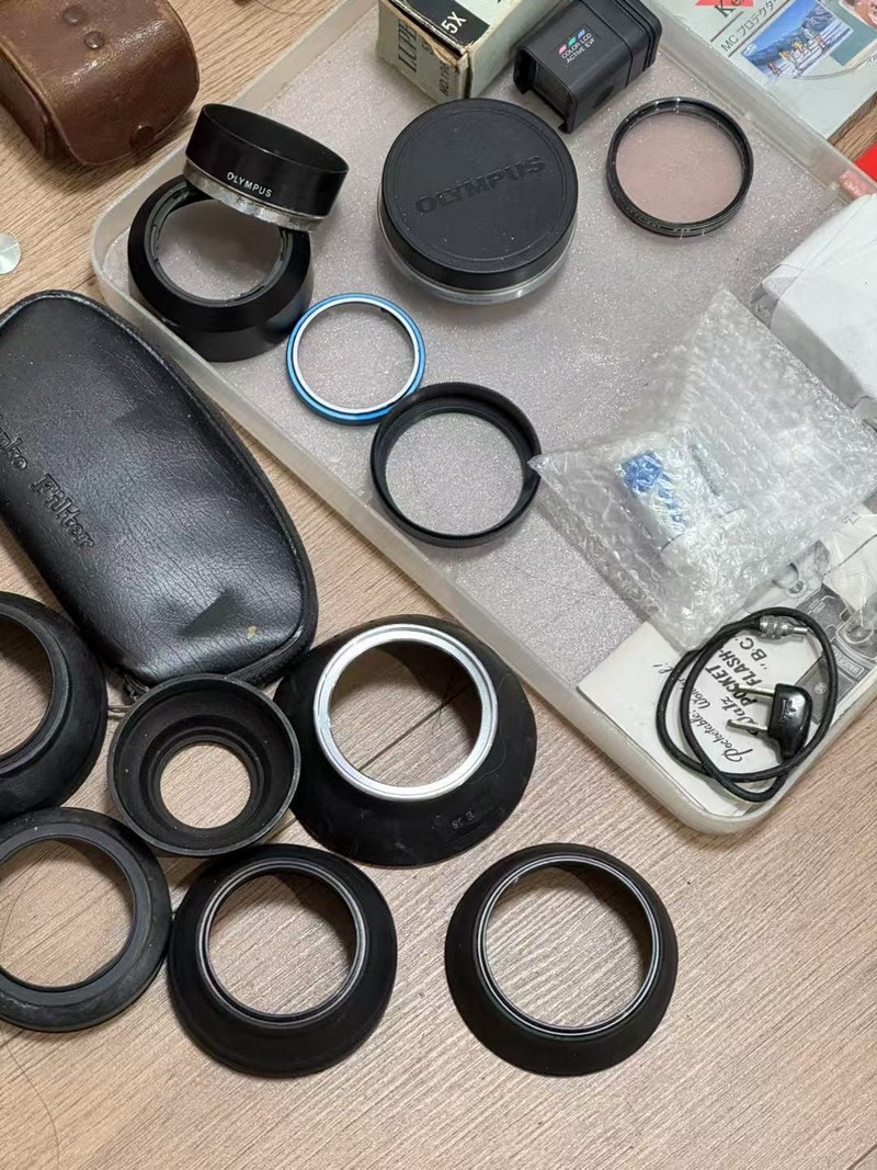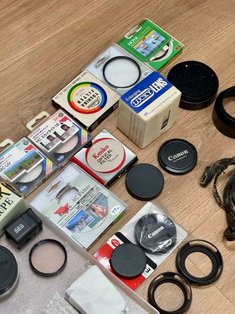 一堆摄影附件,镜头盖,滤镜,遮光罩,佳能,奥林巴斯,宾得,hoya,kenko
